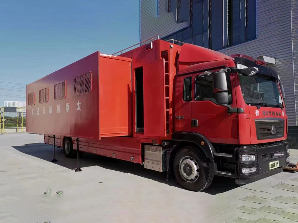 該宿營車主要由汕德卡底盤、廂體、兩側拓展艙、水電保障系統、調平支腿、影音系統、空氣調節系統、住宿設備等組成。